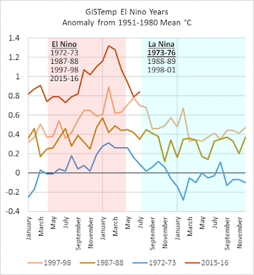 | | Figure 3 | Global mean surface temperature for strong or moderate/strong El Nino years that were followed by a La Nina. Data source: GISS NASA |