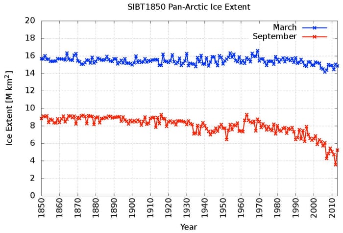 Time series of Arctic sea ice extent, 1850-2013, for March (blue line) and September (red line). Illustration: Walsh et al. (2016)