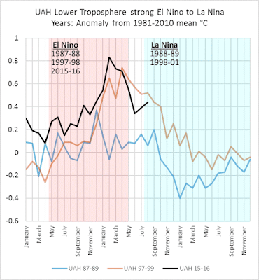 Comparing recent ENSO years Below is a chart comparing the strongest El Niño years since 1979, which were followed by a La Niña, just for UAH v6beta. I've included the 2015/16 period for comparison.