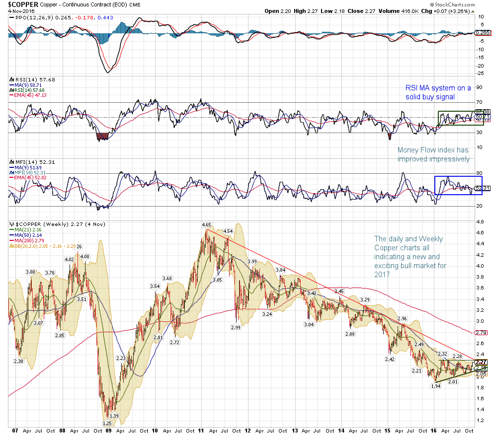 The 10 year weekly copper chart is showing that the RSI MA system is on a solid buy signal, as is the Money Flow index, the copper market has created a bottom with a very bullish ascending triangle that we are in the process of breaking out of and this coincides with the downtrend line which would also be taken out given this Bullish situation.