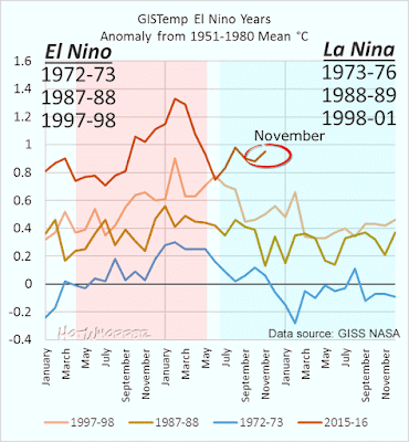 | | Figure 3 | Global mean surface temperature for strong or moderate/strong El Nino years that were followed by a La Nina. 2015/16 is shown for comparison, but there has not been a La Nina this year. Data source: GISS NASA |