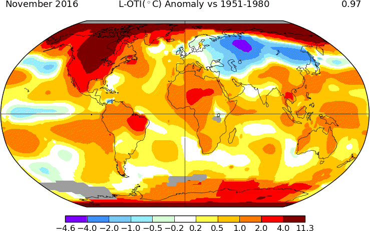 According to GISS NASA, the average global surface temperature anomaly for November was 0.95 °C, which is the second hottest November on record, and only 0.07 °C lower than the hottest November during the El Niño in 2015.