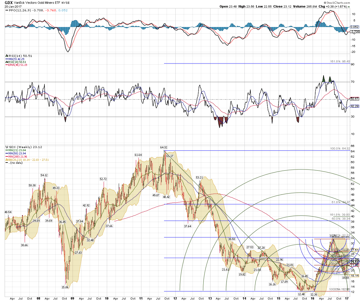 It will enhance the bull case for GDX when it takes out the 2 .382 retracement level cluster justabove friday's close the levels are 23.58 and 24.30 ish.....