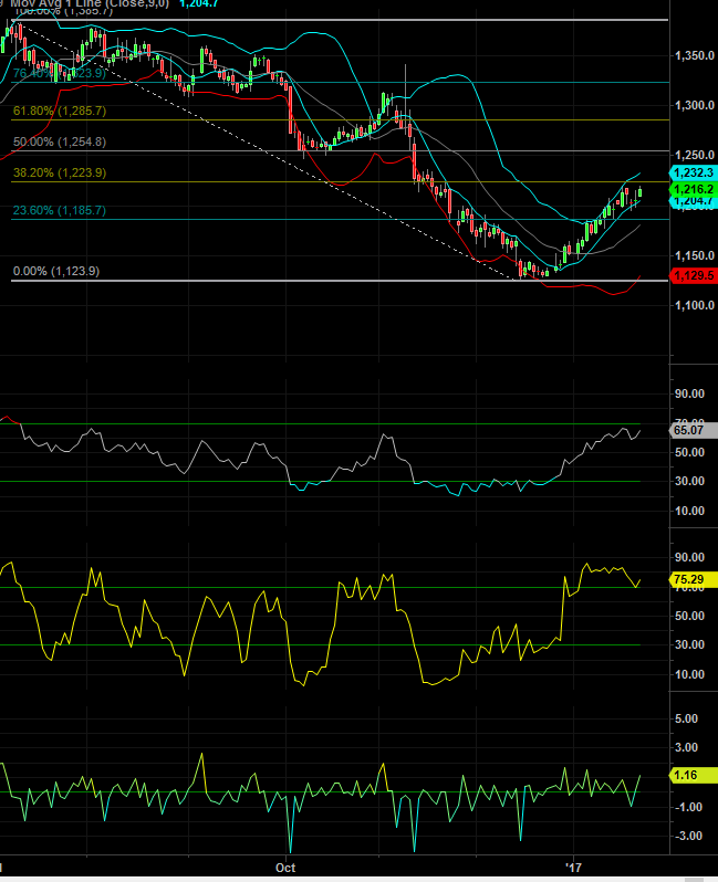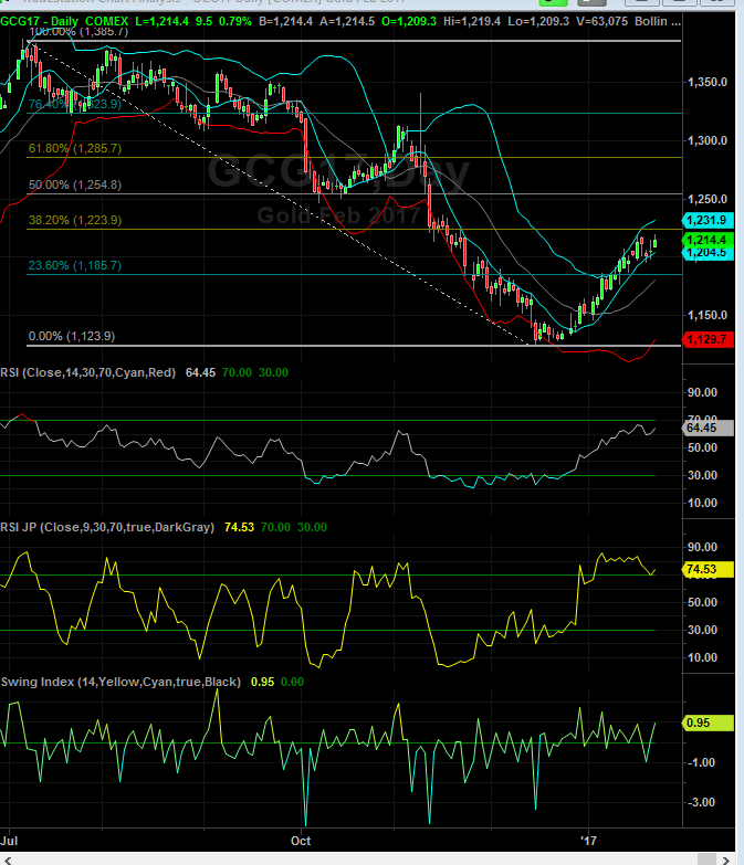 The daily gold futures get Gold to close above the .382 at $1223.9