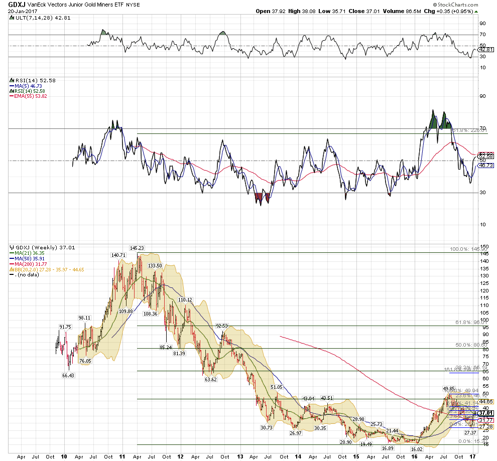 2 Year weekly GDX chart there is some resistance in the area if you can get the GDX to close above the .382 retracemtment about a buck above friday's close that will be constructive.