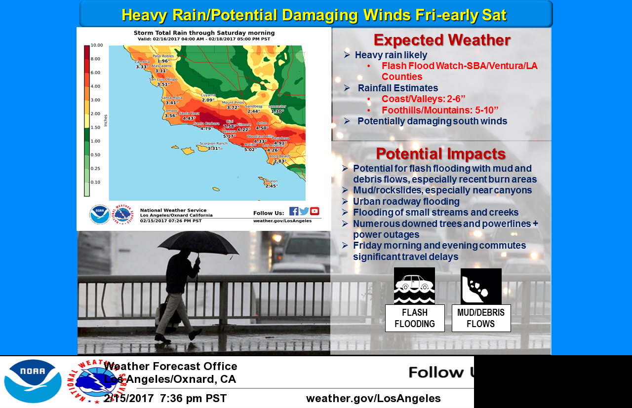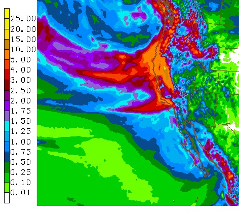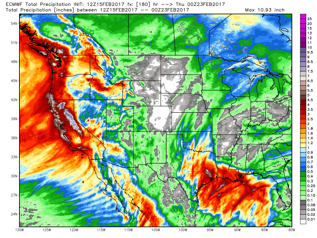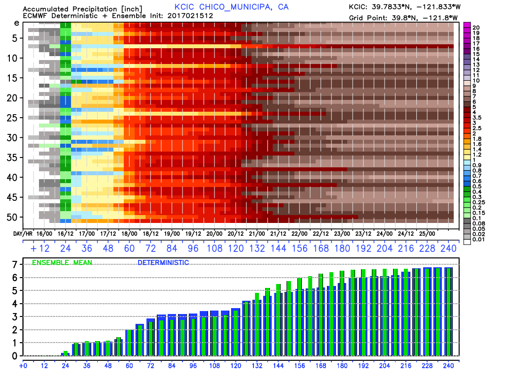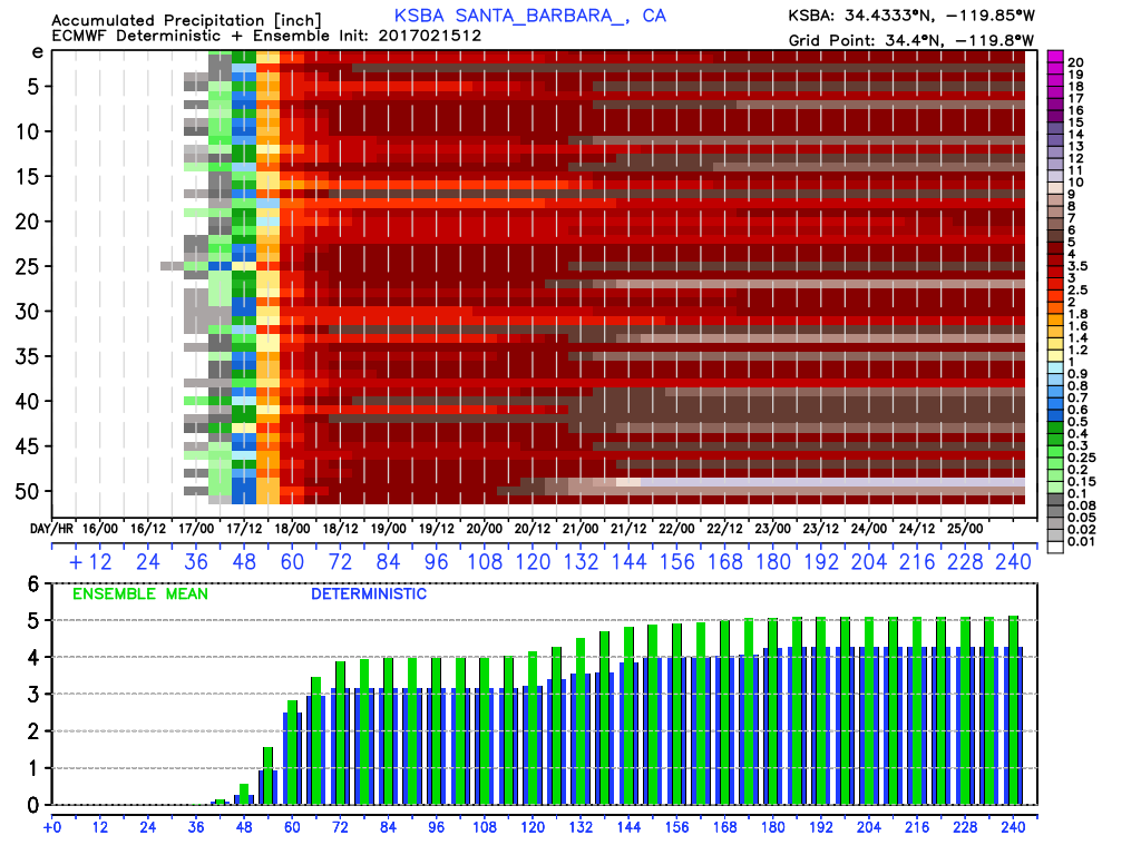 For Some in California, the Worst is Yet to Come After a few day break, California is about to experience a period of very wet weather, with the potential for flooding and slope failures in southern California and threats to the Oroville dam in the north. For the 24h ending 8 PM Wednesday, the fire hose has been mainly directed to the Pacific Northwest, with some locations in the Olympics getting 5-7 inches of rain. But substantial rain (greater than 2 inches) extends into the Cascades and down the coast to northern CA.  Now it is California's turn. The U.S. GFS model forecast for the next 7 days is amazing, with portions of the Sierra Nevada near the Oroville dam getting 10-20  inches of rain. Very bad. And heavy precipitation will hit southern CA as well, where flood and slide warnings are now in effect (see NWS warning page)  The European Center model precipitation for the same period (shown below) has a similar solution, with as much as 7-9 inches over the Sierra Nevada.  But how much uncertainty is there in this forecast? For Chico, CA (near the Oroville dam at lower elevations), the European Center ensembles (many forecasts) are all on pretty much the same page. (each line in the upper panel \represents one forecast). One event starting tomorrow, with the heaviest precipitation on Friday. Then another event later Sunday and Monday.  The ensembles for Santa Barbara are also in agreement for a big event on Friday, with even heavier precipitation in the mountains.  This could well be the wettest storm of the year in southern California and damaging slides and floods are quite possible. Posted by Cliff Mass at 9:23 PM