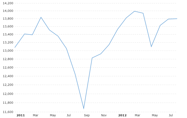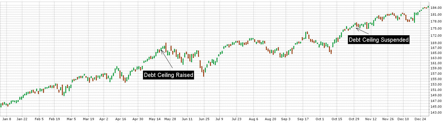 In May 2013, the debt ceiling was met and raised. In October 2013 the debt ceiling was suspended pushing off the issue. Although markets rebounded, they were volatile around news as the risks of a default loomed.