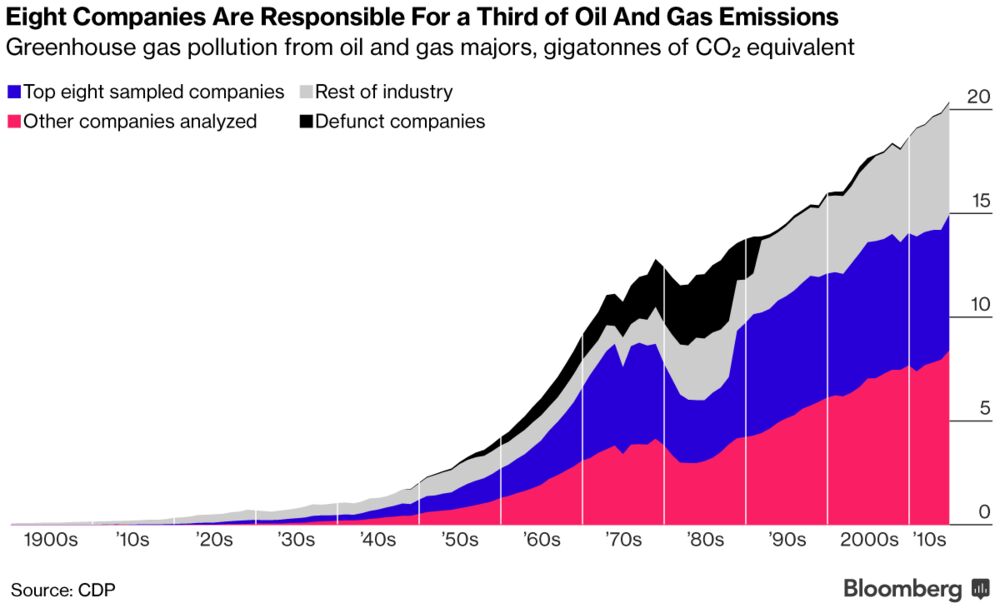 CDP analyzed 50 oil and gas companies, gauging their direct emissions and pollution from the use of their products dating back to 1854. The whole oil and gas industry combined produced about 40 percent of the world’s 832 gigatonnes of carbon dioxide equivalent released in the past three decades, according to CDP.