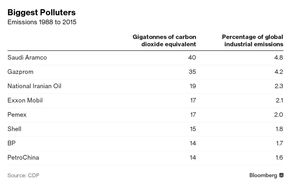 China National Petroleum Corp and Petroleos Mexicanos complete the list of the eight companies that in 2015 emitted 6.59 gigatons of CO2 equivalent. That’s almost the same amount as the U.S. emitted that year.