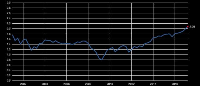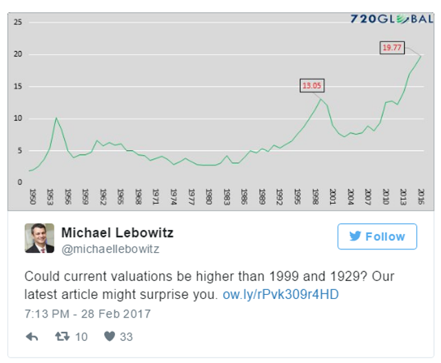 Naysayers will point to low inflation and low interest rates as the reason that this and other ratios are so high. There is some validity to that argument and I will not try to deny it. However, it becomes more and more difficult to sustain this multiple as interest rates rise. Inflationary pressures may be rising as well as wages start to experience some upward pressure in certain skilled areas of the workforce. But this is not the only evidence that leads me to think this market is in bubble territory.
