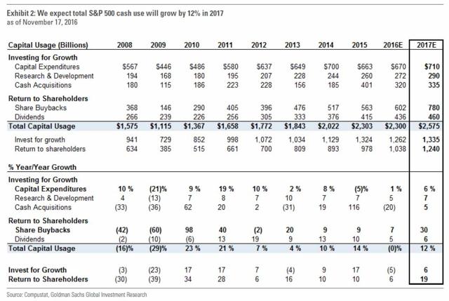 Let me try to explain this in another way. Since 2011, when EPS for the S&P 500 were $93.56, the index value has risen from 1257.60 to the current value of 2,372.60, or 88.7 percent. The S&P 500 EPS for 2016 were $89.61, representing a decline of 4.2 percent. To make matters worse companies have been buying back shares at a record pace in recent years. The total value of share buyback by S&P 500 companies during the last five years (2012-2016) is over $2.5 trillion according to Goldman Sachs. That represents more than ten percent of the current total market capitalization (share price x number of shares outstanding) for the entire index of $21.35 trillion. So, if those shares had not been repurchased to support share prices would the market still be at this level? That was a hypothetical question; just something to think about. And the ten percent figure is really closer to 12 percent but many shares were purchased in previous years when the total market cap of the index was much less (under $12 trillion at the end of 2011) so the real impact was far greater.