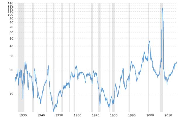If we were to remove the craziness of the periods that led up to the bubble peak in 2000 and the earnings trough in 2008 the pattern becomes much clearer. So just ignore those two spikes and look closely at the rest of the chart. What I want you to notice is that faint dotted line that indicates a PE of 20. Now, notice how rarely the market goes above that line, how short the time usually is that it remains above that line and what often happens shortly after breaching that level.