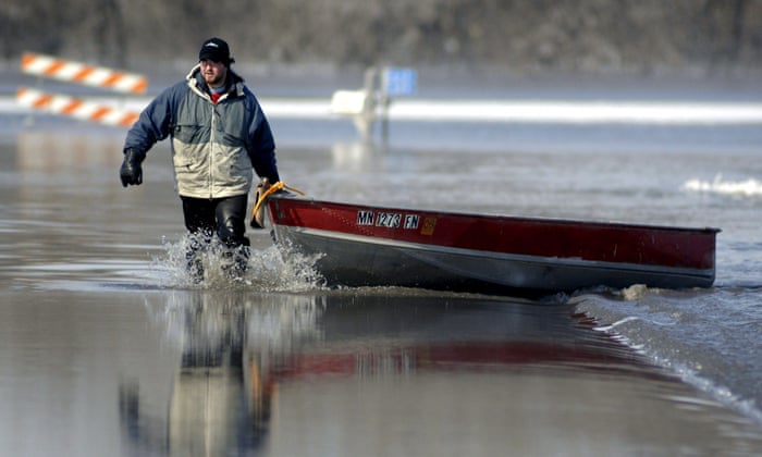 Jared Bakko hauls a boat down a flooded road after taking supplies to his grandmother as the Red River flood waters began to recede just south of Moorhead, Minnesota, USA, 28 March, 2009. EPA/CRAIG LASSIG Photograph: Craig Lassig/EPA