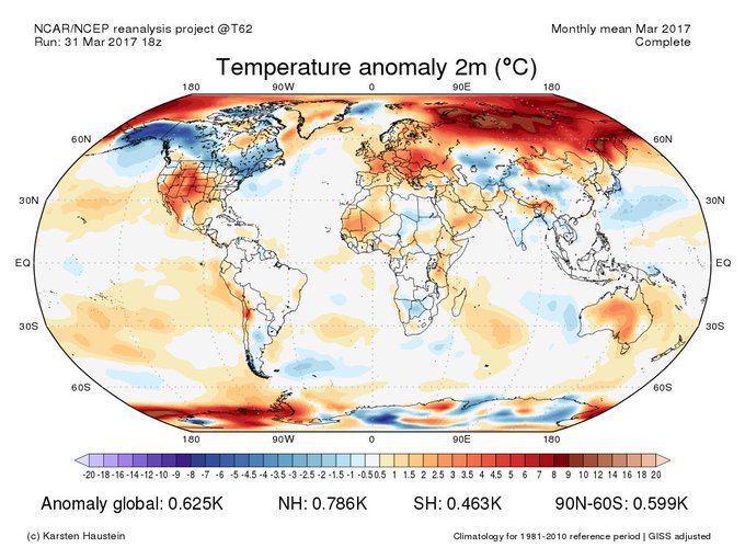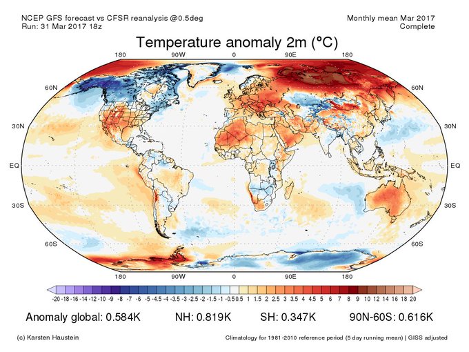 Both, March GFS analysis & NCEP reanalysis 0.03K warmer than Feb. Corresponds to +1.07K in @NASAGISS Easily 2nd warmest March #climatechange