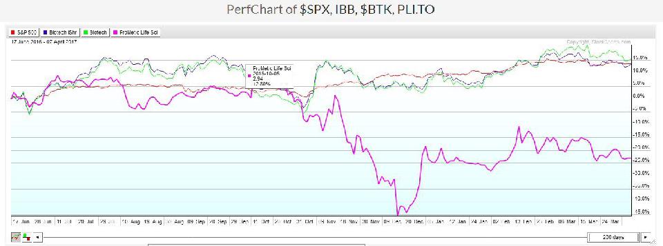 Perfchart of $SPX, IBB, $BTK, PLI.TO