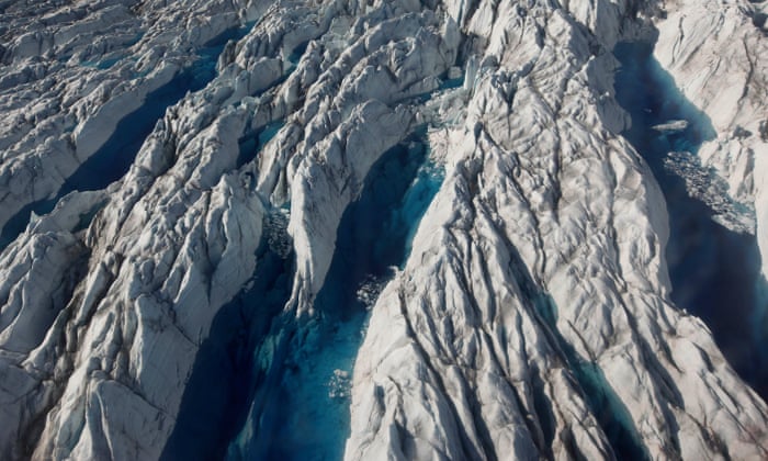 In this July 19, 2011 photo, pools of melted ice form atop Jakobshavn Glacier, near the edge of the vast Greenland ice sheet. Photograph: Brennan Linsley/AP