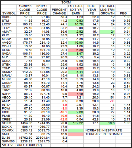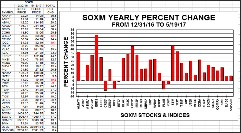 This is the weekly update of the SOXM stocks and major indices from the first of the year to Friday's closing prices in actual and percent change in table and chart formats.