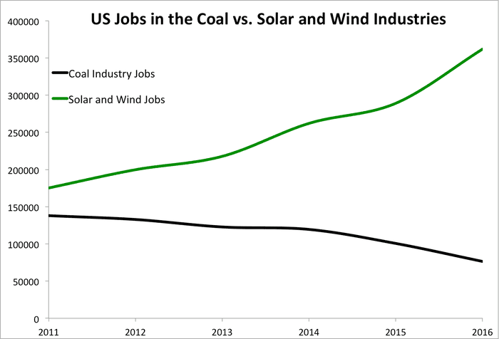 US jobs in the coal industry vs. the wind and solar industries (2011–2016). Data from the US Federal Reserve, American Wind Energy Association, and The Solar Foundation. Illustration: Dana Nuccitelli