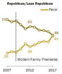 This is pretty incredible: Republican views on same sex marriage from 2007-2017. Look at the movement since Modern Family premiered in 2009.
