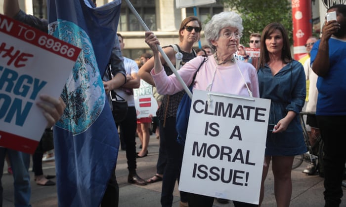 Environmental activists protest Donald Trump’s decision to exit the Paris climate accords, which set a goal of avoiding warming beyond 2C. Photograph: Scott Olson/Getty Images Oliver Milman