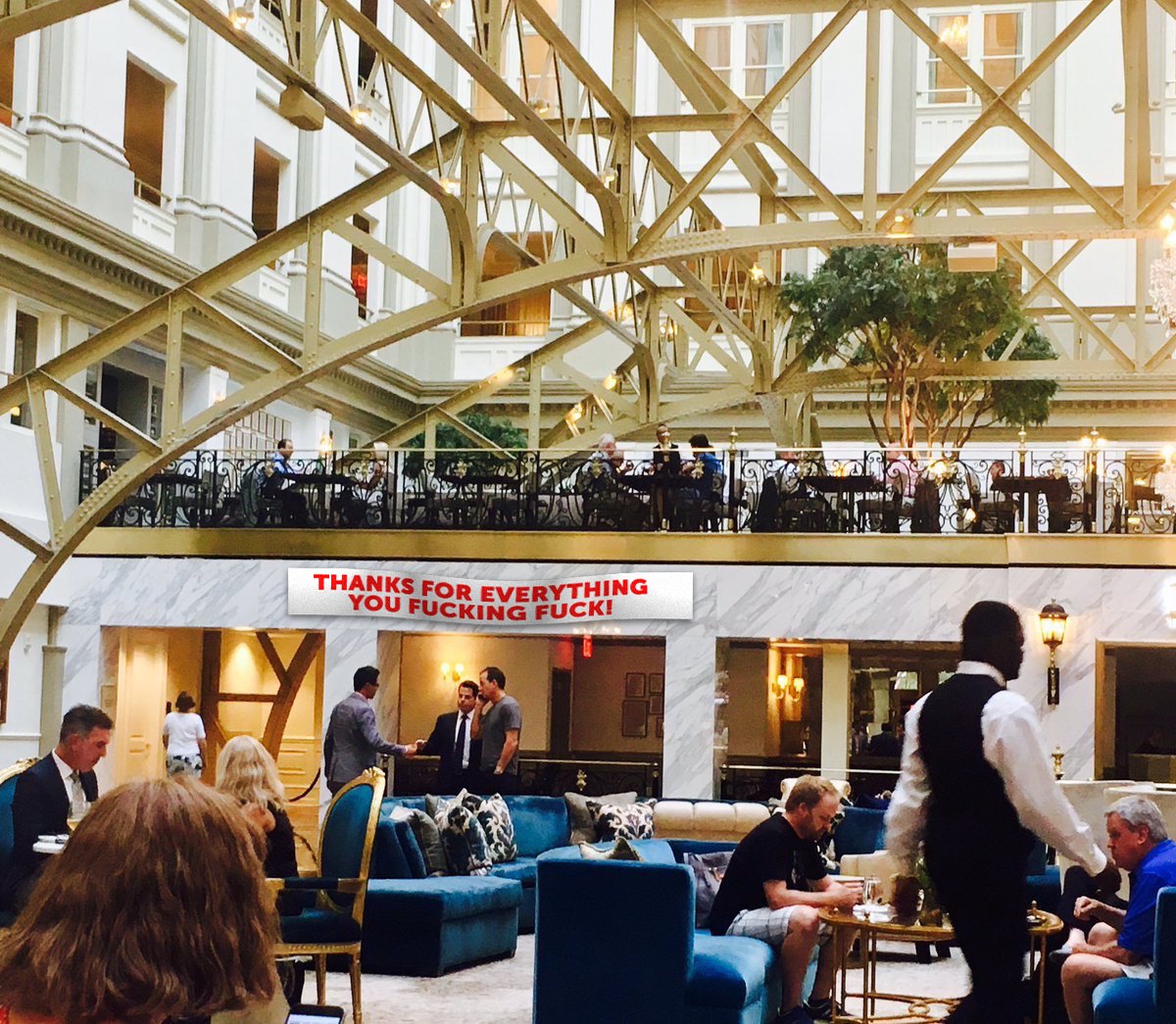 Just watched The Mooch enter Trump hotel lobby & pause for attention..none. Few steps, pause, pose..none. Few steps, pause, pose... @swin24!
