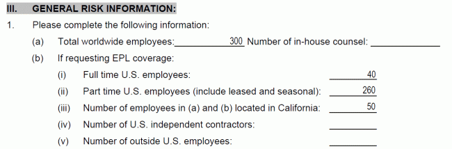 To illustrate this, I want to show you the insurance application I just received. Most companies have something called employment practices liability insurance. This insurance helps pay legal and some settlement expenses if and (nowadays) when a company is sued by an employee for things like discrimination or harassment or any of the variety of sue-your-boss offenses California has established. In that multi-page application, after the opening section about name and address, the very first risk-related question asks this: