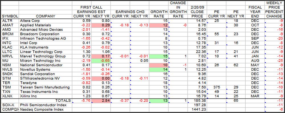 Anyway, I still have the data archived so this is the recreated table. Note the extreme carnage throughout the table. Bottom line Current Year estimates are negative -5.76. Next Year is only +2.84. Earnings estimates were still going down for several stocks. Most of all, note the closing prices and the right most column that shows the loss for the week with all stocks down "big time". The SOX closed at 197.28, down -11% for the week. The NASDAQ closed at 1441.23, down -6%.