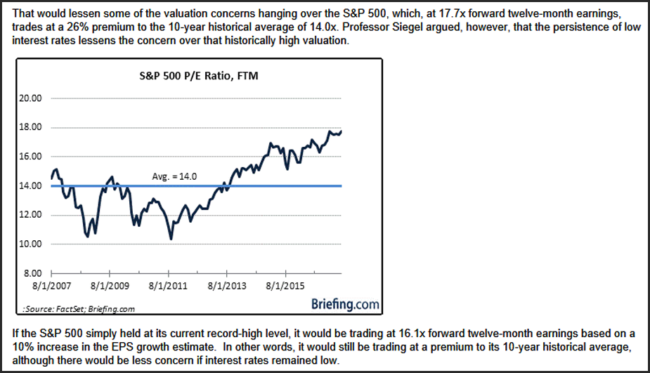 The market is in an "extended" valuation now compared to the average over the years. Here is an article that addresses that issue from Briefing.com.