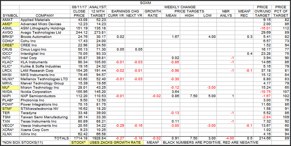 This is the weekly look at changes in several of the parameters for the SOXM stocks.