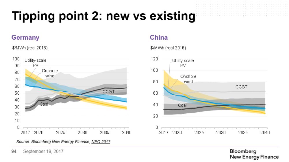 The second tipping point, a little further off, is when it’s more costly to operate existing coal and gas plants than to take power from wind and solar. The chart below, from BNEF forecasts, indicates that point may arrive in the middle of the next decade in both Germany and China.