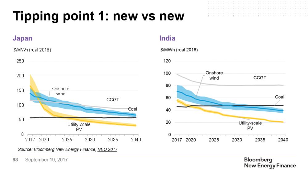 “The first is when new wind and solar become cheaper than anything else,” Liebreich said. The slide below from his presentation indicates that in Japan by 2025 it will be cheaper to build a new PV plant than a coal-fired power generator. That milestone will be passed in India for wind power by 2030.