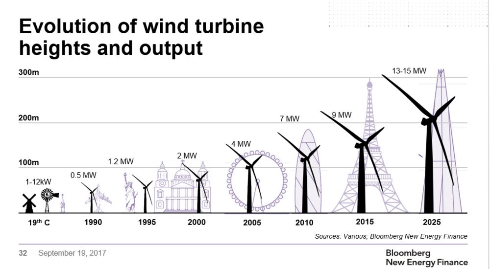 In a presentation to the research group’s conference in London on Tuesday, Liebreich said technology that’s slashing the costs of wind and solar farms makes it inevitable that clean energy will become more economical than fossil fuels for utilities in many places. The most visible advance is in the scale of wind turbines, highlighted by the chart below.