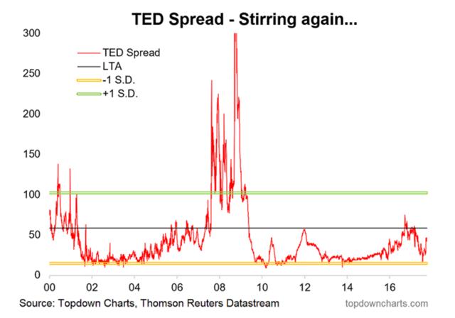 The author does not argue that the TED spread is at this point a bearish indicator, but rather that the trend does appear to be moving higher and that the indicator is worth keeping an eye on.