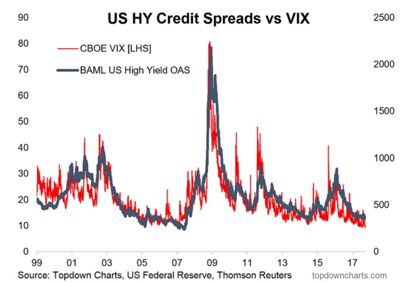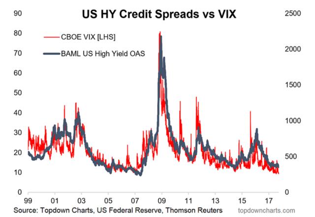 What makes the activity in the TED spread a little more interesting is how it stands in contrast to the very calm/complacent/confident readings of the CBOE VIX and US High Yield credit spreads. The mid-2000s period showed us just how long such complacency can last, and as long as the economy is doing fine and no risk events materialize, it can stay that way.