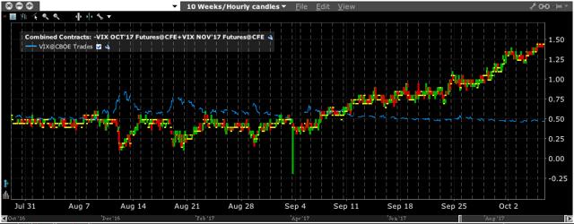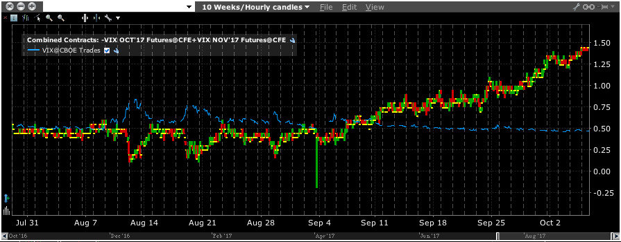 Above is the F1-F2 VX futures contract. Consistent with contango, the spread is widening as we approach the Oct 18 th expiration of the front month. We believe this spread can widen out quite a bit further than what we're seeing, though perhaps it is time to take a breather until after the jobs release. If we get an extreme print tomorrow - higher or lower - we'd much rather be long the Oct than the Nov.