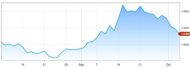 Sterling appears to have peaked with PM May's Florence speech on September 21. The decline appears to be accelerating.