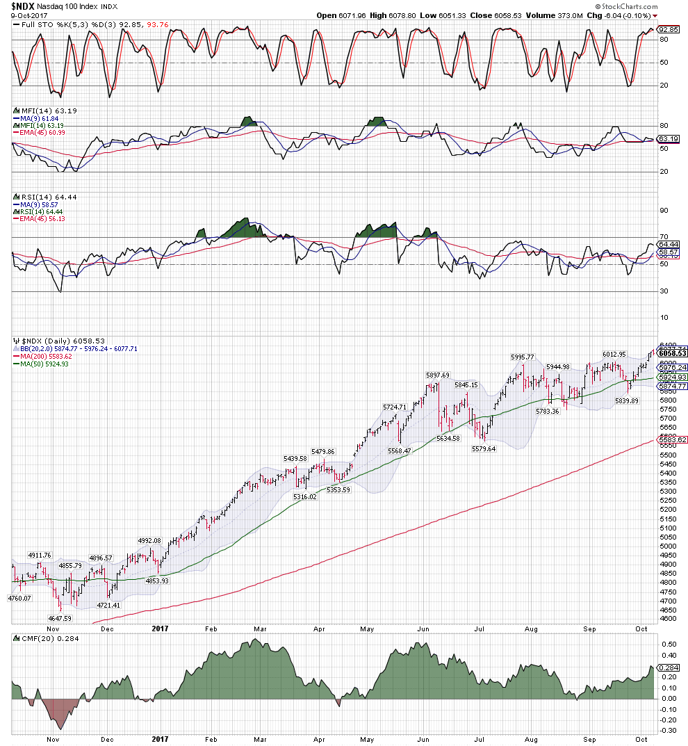 The NDX weekly chart is showing Momentum divergences from the Peak Momentum on the RSI on June 9 2017. also on a weekly basis the last few weekly highs have been on weaker momentum, the Money Flow