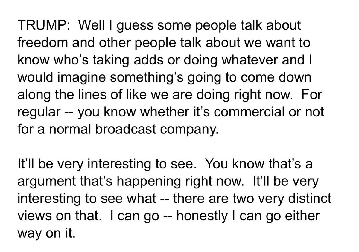 President Trump to @MariaBartiromo on the prospect of new regulations for the tech industry: “Honestly I can go either way on it.”