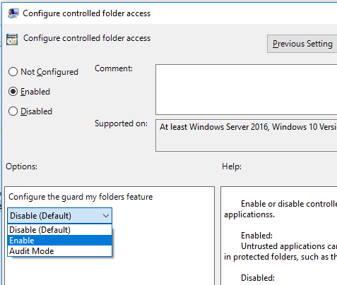 Set-MpPreference -EnableControlledFolderAccess Enabled To disable the feature, just run the same command, but with the "Disabled" argument.