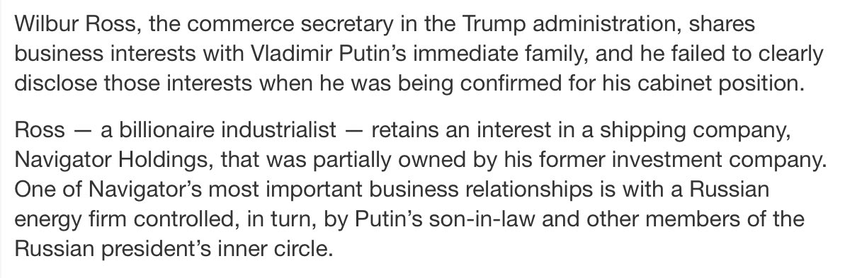 Wilbur Ross in business with Kremlin insiders, including Putin's son in law. And this wasn't disclosed when he was confirmed. Sheesh. Are there no Team Trumpov people not in bed with Russia?