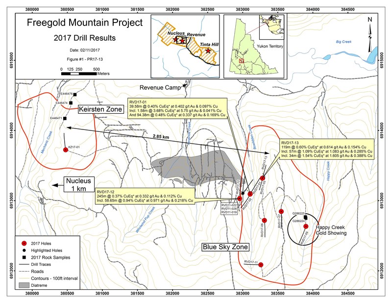 Porphyry mineralization at Revenue extends from at least the Keirsten Zone to the Blue Sky Zone, and was encountered in the farthest step out holes both east and west of the Revenue diatreme. The mineralizing system is composed of a large porphyry, at least 2.85 km in strike length, with a mineralized diatreme in its center and the Nucleus gold deposit off its western flank. If gold mineralization encountered in the newly discovered Happy Creek showing is also porphyry related then the strike length of porphyry mineralization is increased to 3.6 km. Within the diatreme and surrounding granite there are numerous drill intersections of good copper-gold, silver and molybdenum grades, however, now with the results of 2017 drilling, there is a demonstrated zone of high-grade, gold-rich, porphyry style mineralization that extends at least 450 meters from the eastern margin of the Revenue diatreme eastward into the Blue Sky Zone, where it appears to be increasing in grade, and remains open to the northeast and depth.