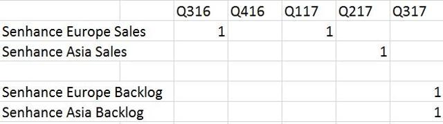 Despite Aggressive Marketing, European Sales of The Senhance System Has Been Almost Non-existent TransEnterix acquired the Senhance (formerly ALF-X) robot in September 2015. According to TransEnterix management, the company immediately began aggressively showing it to surgeons. The company says the sales cycle for a surgical robot is between 4-6 quarters. It has now been over 8 quarters, so the company is well past this stated sales cycle. The following are the Senhance sales and backlog the company has accomplished so far in each quarter: