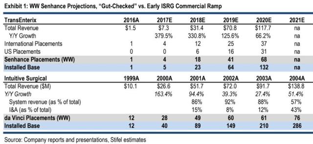 However, the flaw in this thinking is today’s period of surgical robots is different from 2000. In 2000, Intuitive Surgical was establishing a proof of concept for surgical robots. In general, once a first mover starts an industry, it takes a few years for that industry to become mainstream. However, today, it is already proven that surgical robots provide a valuable benefit to surgeons, and it is mainstream. Therefore, if a new entrant is better and/or cheaper than the da Vinci, then it shouldn’t take long for sales to ramp up. But sales aren’t ramping up for the Senhance. Also, when the da Vinci was first created, it had no competition, so that made sales easier. The Senhance is in direct competition with the da Vinci. For these reasons, comparing the Senhance today to the da Vinci back in 2000 is like comparing apples to oranges. The following is a comparison of the two companies' early robot sales years by Stifel: