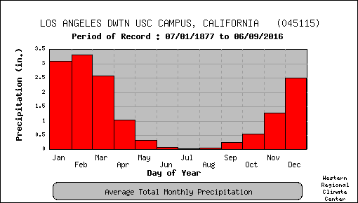 And in any case, southern CA climatologically gets very little precipitation during the fall--and this the impacts are minor. For example, at downtown LA (see below) Sept. and October get .5 inches or less and November only 1.25 inches. Not enough to make much a difference when a strong Santa Anna wind is blowing.