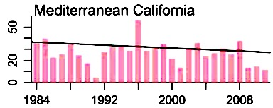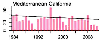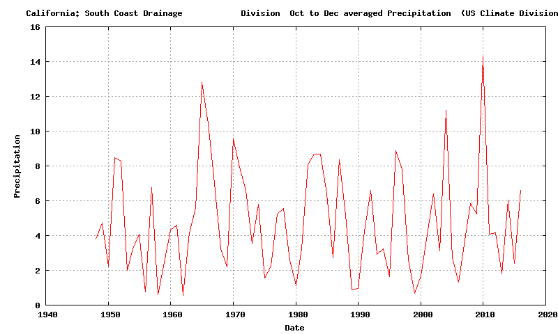 But two facts contradict such a suggestion. First, there is no trend in late fall (October to December) precipitation over the southern CA coastal zone (see below). Here is the proof. And there is no downward trend in December precipitation either (see second plot).
