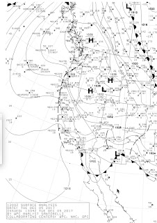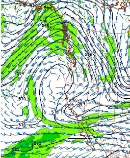 The two big events this year, and a deep collection of peer-reviewed research reports show that virtually every major coastal wildfire event has been been associated with strong offshore winds. In southern California they are known as Santa Anas and in central California as Diablo Winds. The meteorological set ups for these event are very similar: surface high pressure builds in across the intermountain west, establishing offshore winds at crest level of the regional terrain, and an offshore pressure gradient at lower levels. The pressure pattern at 4 PM Tuesday illustrates this pressure configuration at the surface (and the upper air map at 500 hPa--roughly 18,000 ft-- at the same time is also shown). Note the position of the upper level ridge: just off the Pacific Northwest. And you can see the strong offshore flow at higher levels in the 500 hPa map.