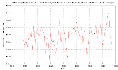 Let's see if observations support their claims. Are upper high pressure ridges becoming more frequent just west of the Pacific Northwest? Using the reanalysis grids available from NOAA ESRL, I created a time series of the heights/pressure in this critical area for the cool season (November to March)....see below.