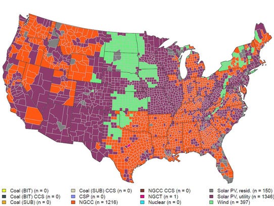 This map from UT Austin's Energy Institute shows the cheapest cost of new electricity generation in every U.S. county. The map is dominated by large-scale solar (purple), natural gas (orange) and wind (green). (For this map, large-scale solar is priced at $1 per Watt and residential solar is priced at $1.50 per Watt.) (Photo: Jay Calderon/The Desert Sun)