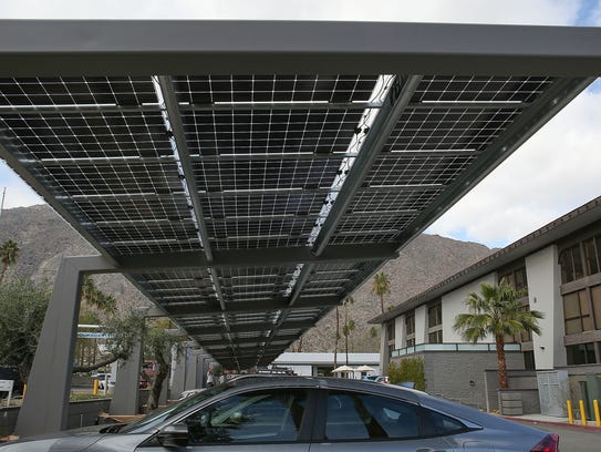 A solar shade structure installed by Hot Purple Energy generates electricity in the parking lot of The Five Hundred building in downtown Palm Springs on Feb. 3, 2017. (Photo: Jay Calderon/The Desert Sun)