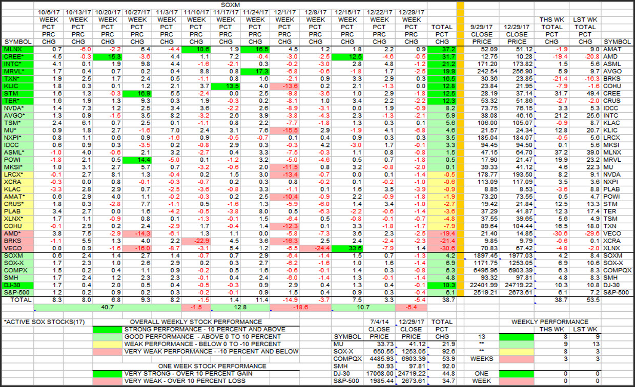 This is the weekly update of the 13 week rolling quarter for the SOXM stocks and major indices in actual and percent terms. This is a special week in that it is the final calendar quarter for 2017 finishing out the year.